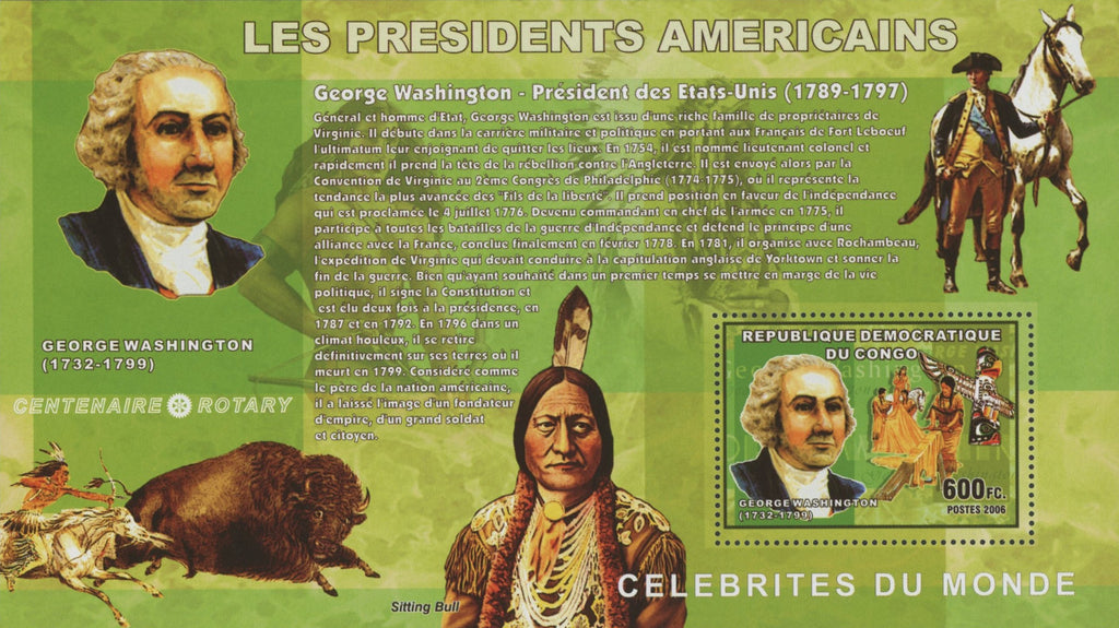 Democratic Republic of the Congo American Presidents George Washington United States Native Sitting Bull Arrow Hunt Horse Feathers Souvenir Sheet of 1 Stamp Mint NH